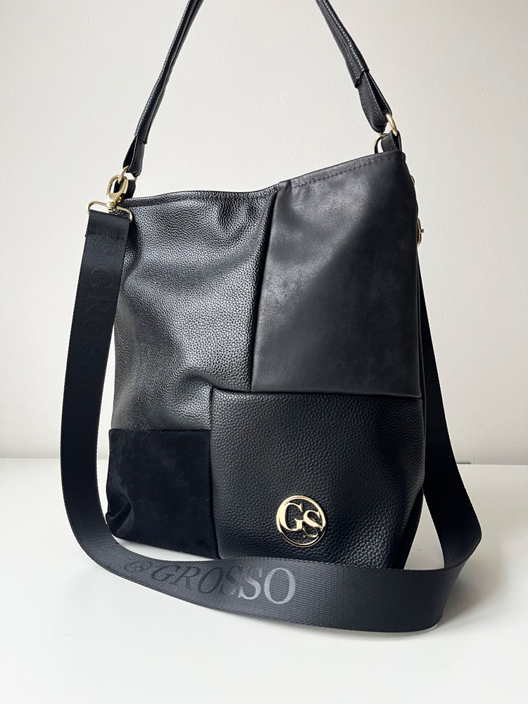 Čierna športovo-elegantná kabelka GROSSO zaujme štýlovou kombináciou materiálov na prednej časti, ktorá jej dodáva jedinečný vzhľad. S klasickým zipsom na vrchu a zlatým okrúhlym logom slovenskej značky sa táto kabelka stane vaším obľúbeným každodenným doplnkom. Vďaka nevystuženému dizajnu sa prispôsobí a pohodlne nosí na ramene. Ideálna voľba pre ženy, ktoré hľadajú štýlový a praktický doplnok na každý deň.