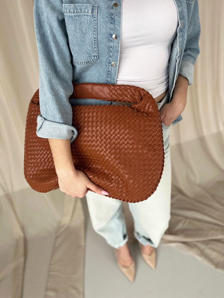 Štýlová prepletaná kabelka, ktorá je dokonalým spojením moderného dizajnu a nadčasovej elegancie. Jemná štruktúra prepletenia pôsobí luxusne a sofistikovane, zatiaľ čo mäkký tvar a výrazný uzol na ramienku dodávajú kabelke jedinečný charakter.