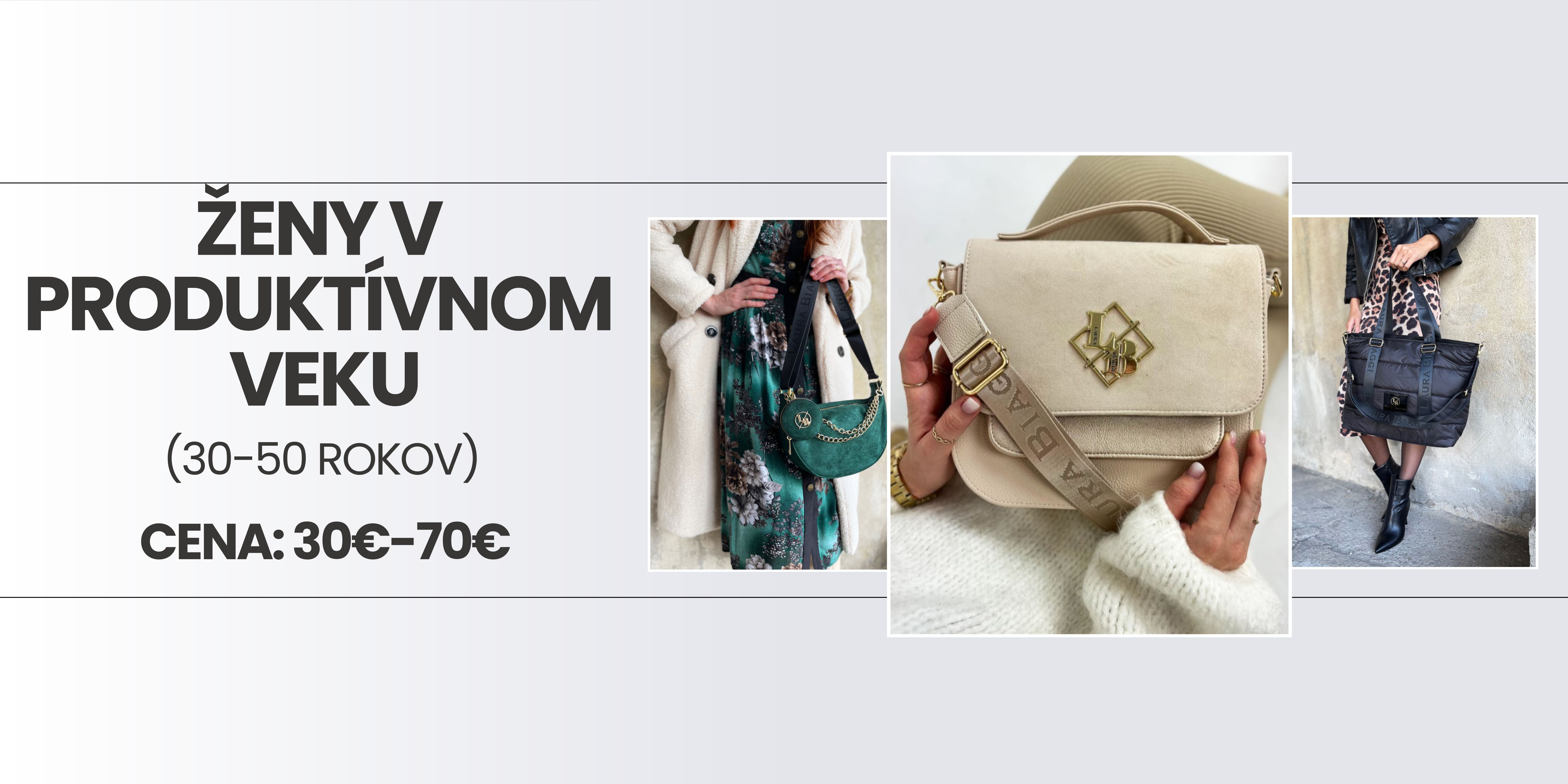 Žena v produktívnom veku potrebuje kabelku, ktoré zvládne hektické dni plné pracovných stretnutí, rodinných povinností či spoločenských udalostí. Kvalitné materiály, ako napríklad ekologická koža alebo pevné textílie sú kľúčové. Nadčasové vzory, jednoduché línie a neutrálne farby, ako čierna, bordová, hnedá či sivá zaručia, že kabelka bude pôsobiť elegantne a štýlovo aj o pár sezón.