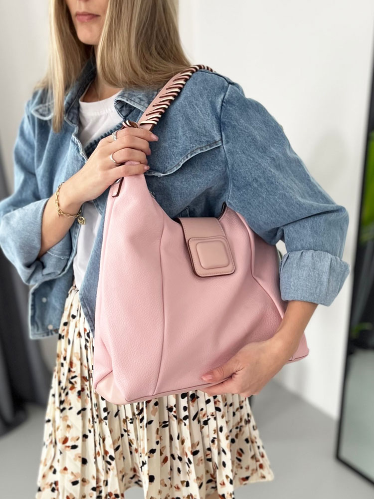 Veľká kabelka na rameno so zaujímavou vypletanou rúčkou a detailmi je skvelou kombináciou elegancie a pohodlia. Nevystužený dizajn sa prirodzene prispôsobí Tvojmu štýlu a potrebám, zatiaľ čo strieborné kovové aplikácie pridávajú moderný a sofistikovaný šmrnc. Táto kabelka sa ľahko kombinuje so športovo-elegantnými outfitmi, čím sa stane vaším univerzálnym doplnkom na každý deň.