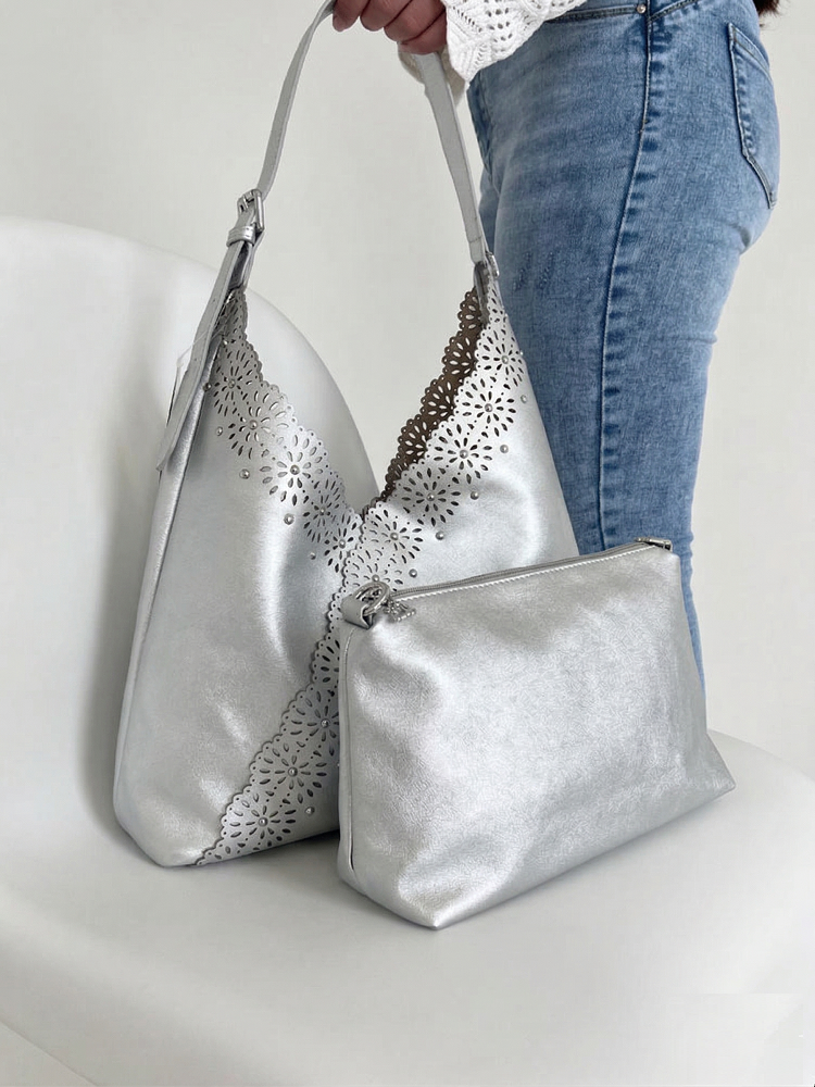 Veľká hobo kabelka na rameno so samostatnou kapsičkou vnútri. Okrem krásneho vyrezávaného okraja zaujme aj svojím obľúbeným tvarom a priestranným vnútrom. Vďaka dlhým rúčkam sa pohodlne nosí po celý deň a nie je vystužená, takže prispôsobí svoj tvar a je navyše veľmi ľahká.
